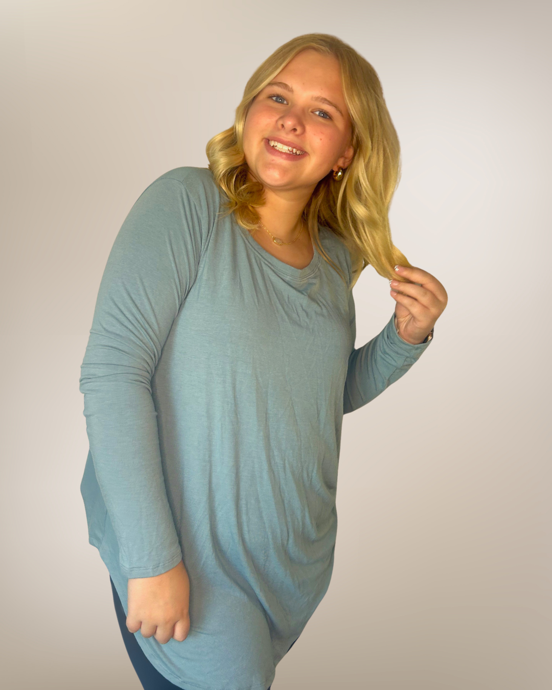 Stay comfortable and stylish with our Blue Grey Perfect Long Sleeve Shirt. Crafted from soft, breathable fabric, this versatile top offers a flattering fit for all body types, including plus sizes. Its timeless blue-grey hue pairs effortlessly with jeans, leggings, or skirts, making it a must-have for year-round wear. Perfect for layering or wearing on its own, this long sleeve shirt combines everyday comfort with classic style.