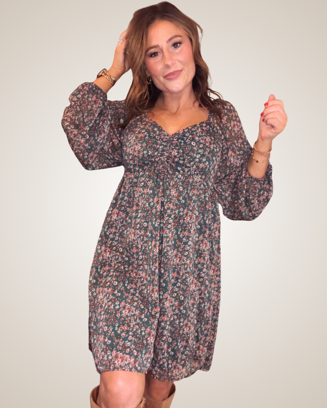 Meet your new go-to floral fav! This dreamy long-sleeve dress features a flattering sweetheart neckline that shows just the right amount of charm. The drawstring ruched bust and softly shirred back create an effortlessly feminine silhouette, while the relaxed shift fit keeps things comfy and easy to wear. Made from lightweight 100% polyester with an all-over floral print, it’s perfect for brunch dates, showers, or anytime you want to feel pretty without trying too hard.