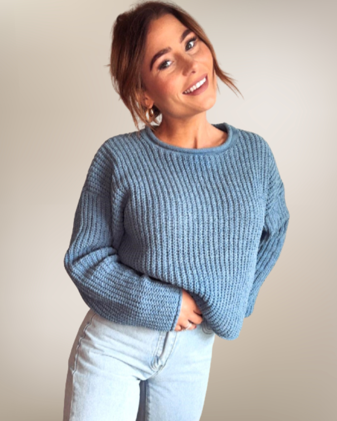 Stay cozy and on-trend with this light blue long-sleeve crop sweater. Soft and comfortable, its relaxed fit makes it perfect for pairing with high-waisted jeans, leggings, or skirts for a casual, stylish look.
