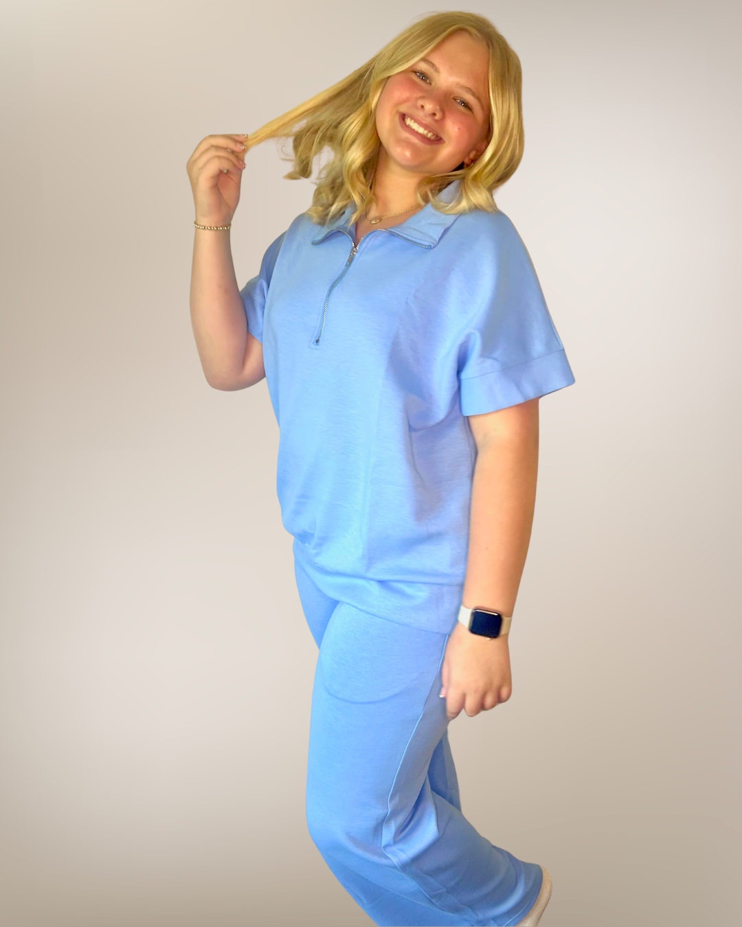 The top features a short sleeve design with a sporty half-zip that adds a little edge, while the matching bottoms keep it relaxed and pulled together—no styling stress required.