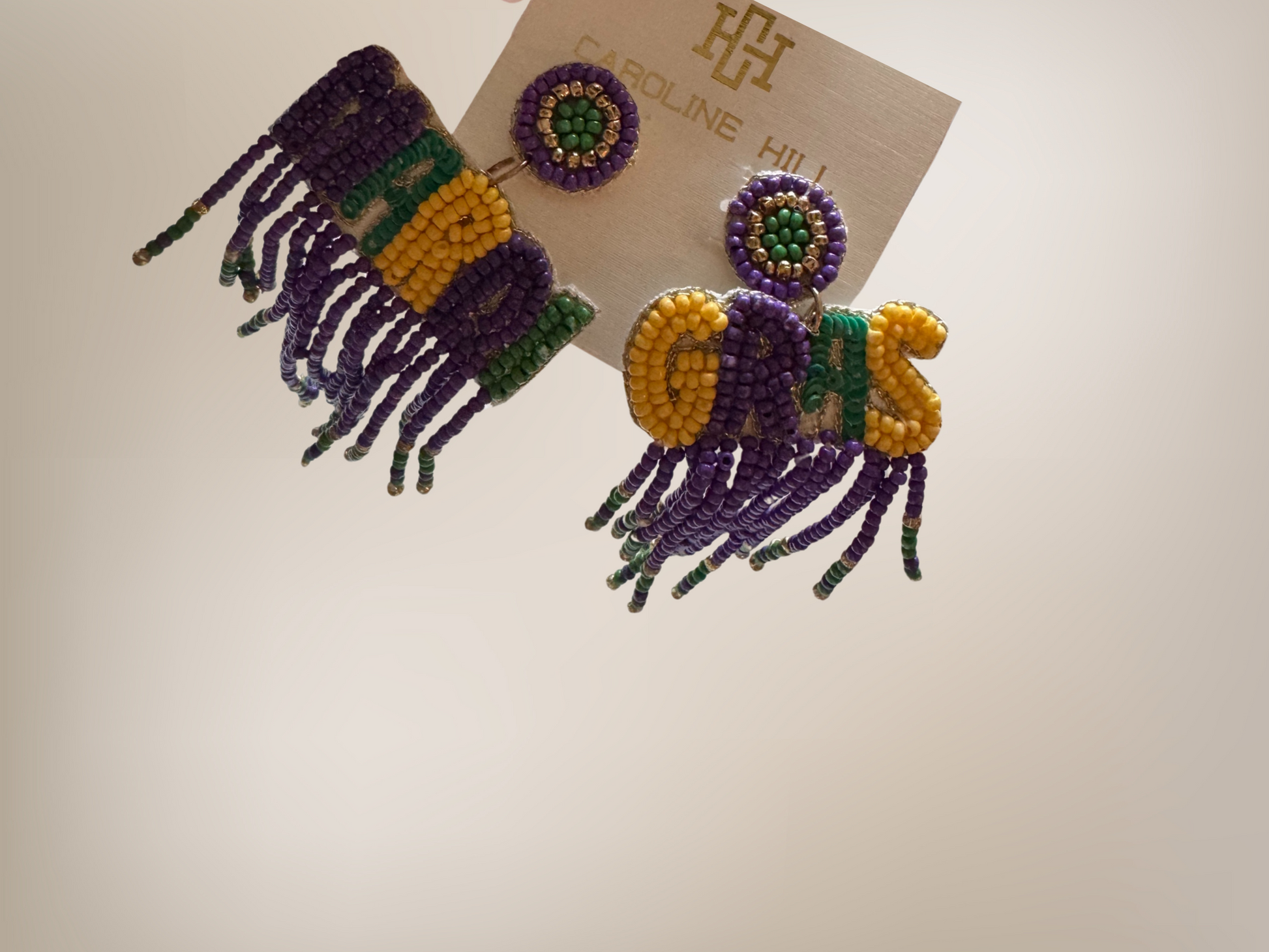 Add festive flair to any outfit with these Caroline Hill Mardi Gras fringe earrings. Colorful, lightweight, and full of movement, they’re perfect for parades, parties, or celebrating in style.