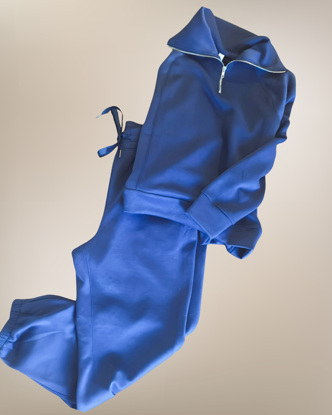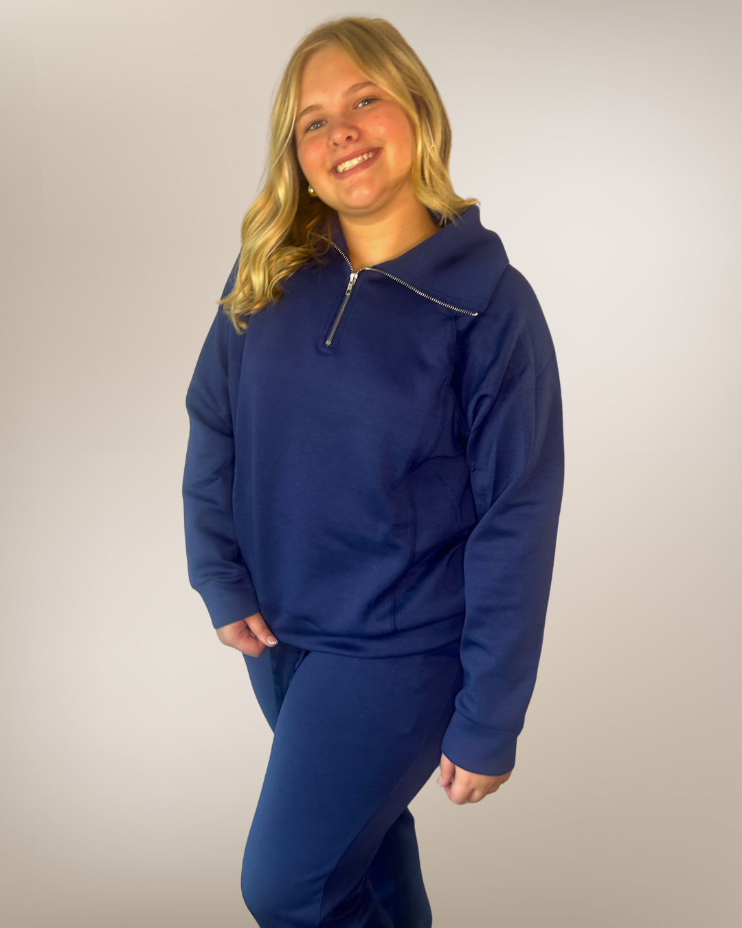 This navy-blue two-piece is made from that soft, lightweight sweats material you love—perfect for staying comfortable without feeling too bundled up.