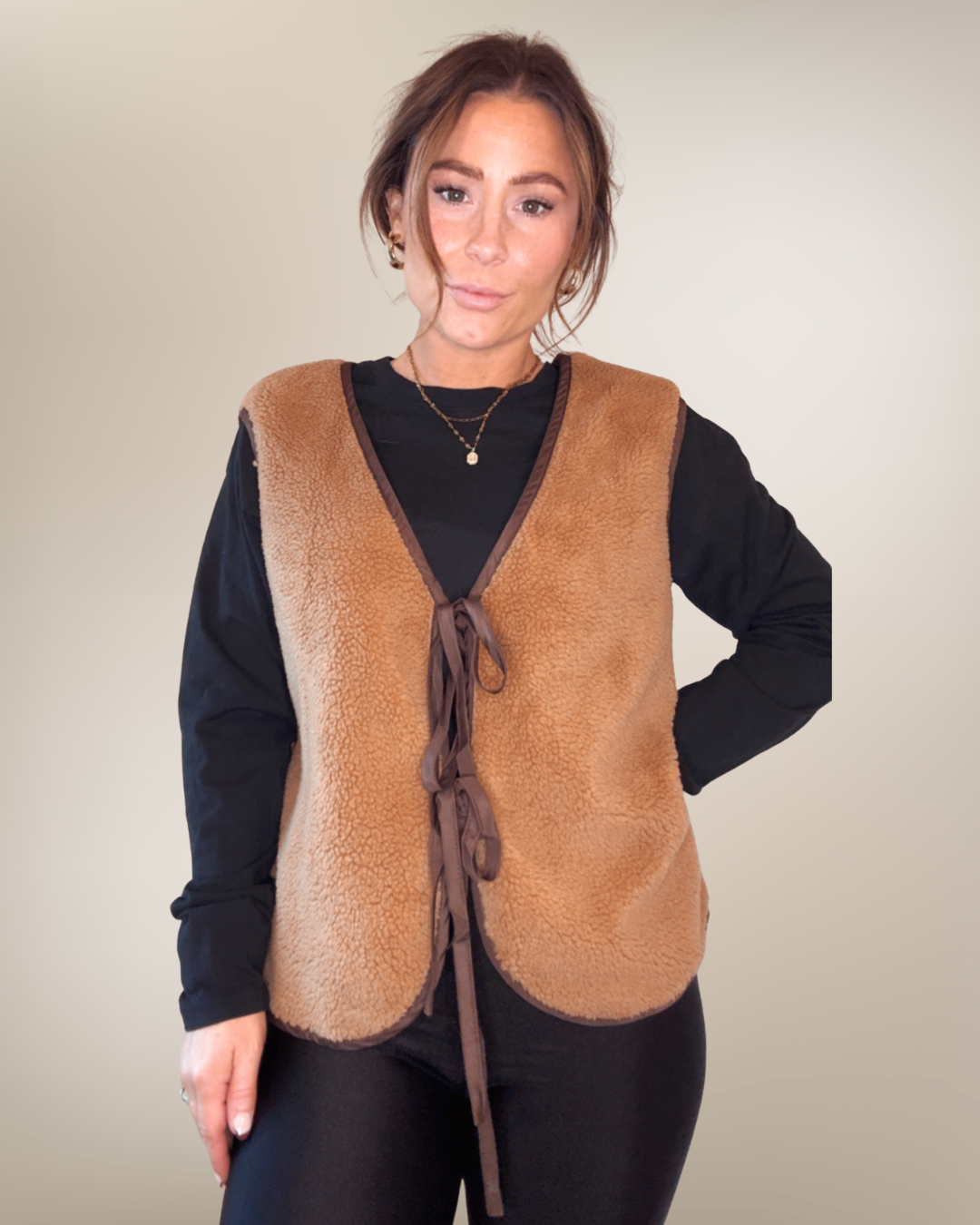 Your new go-to layering piece is here! This solid sherpa vest brings all the cozy vibes with a soft, lightweight feel that’s perfect for everyday wear. The tie-front detail and black trim add just the right touch of style, making it easy to dress up or keep casual. Pair it with your favorite jeans and boots for that effortless “put-together without trying too hard” look.