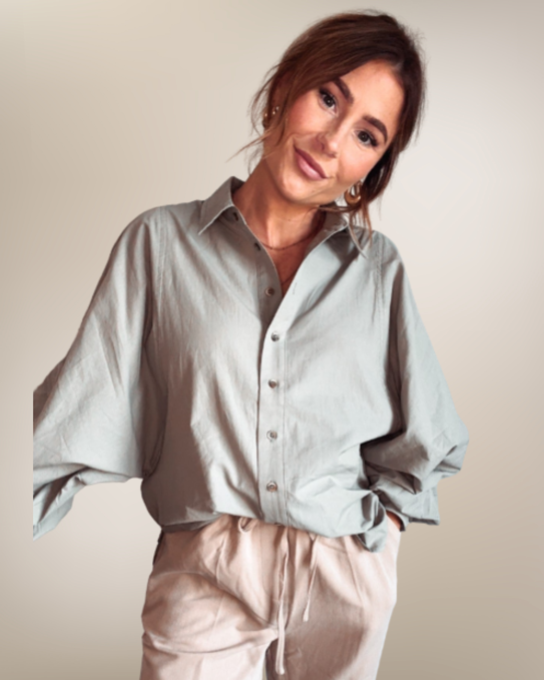 Elevate your wardrobe with this light sage button-down shirt. Lightweight and long-sleeved, it offers a polished, dressy look while remaining comfortable and easy to wear. Perfect for workdays, brunch, or pairing with your favorite bottoms for a refined everyday outfit.